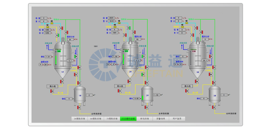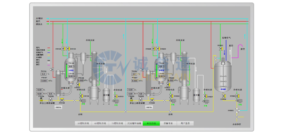雙效濃縮蒸發(fā)器工作在負壓狀況下,真空度、溫度控制顯得格外重要,在控制上以模糊控制和預(yù)測控制等控制理論為基礎(chǔ),建立模糊PID控制算法,對輸入信號進行模糊化,經(jīng)過模糊算法后,再對輸出信號去模糊化同時結(jié)合操作工人的多年實際操作經(jīng)驗,實現(xiàn)優(yōu)化控制,確保藥液濃縮過程中既不會產(chǎn)生泡沫,又能最大限度地滿足企業(yè)的質(zhì)量及產(chǎn)能要求。