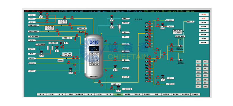 通過對發(fā)酵流程中實(shí)消、空消、保壓、移種、倒種、放料等單元實(shí)現(xiàn)一鍵自動化;并結(jié)合對發(fā)酵過程中常規(guī)各類參數(shù)和部分生化參數(shù)進(jìn)行檢測和控制,有效地提高發(fā)酵單位和提升產(chǎn)品質(zhì)量。